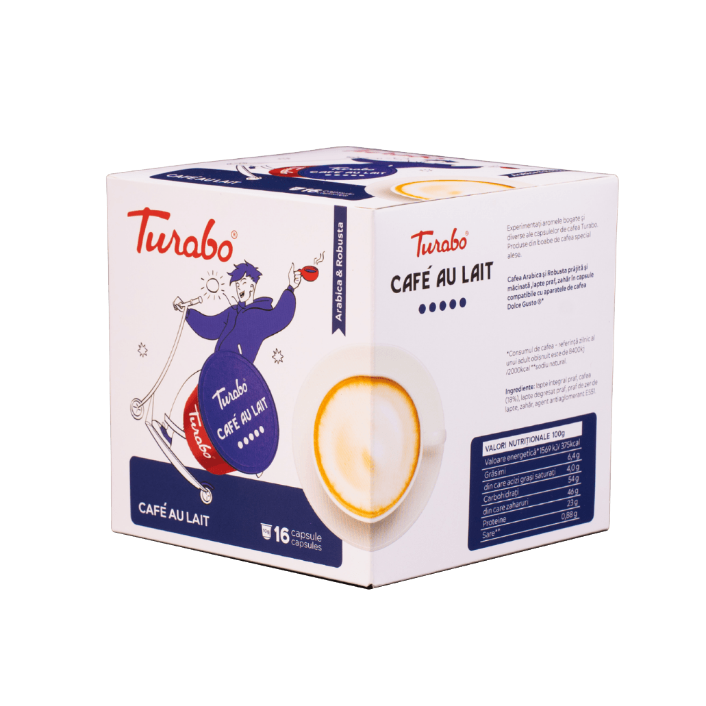 Cafea Arabica și Robusta cu lapte, prăjită și măcinată în capsule compatibile cu aparatele de cafea Dolce Gusto.